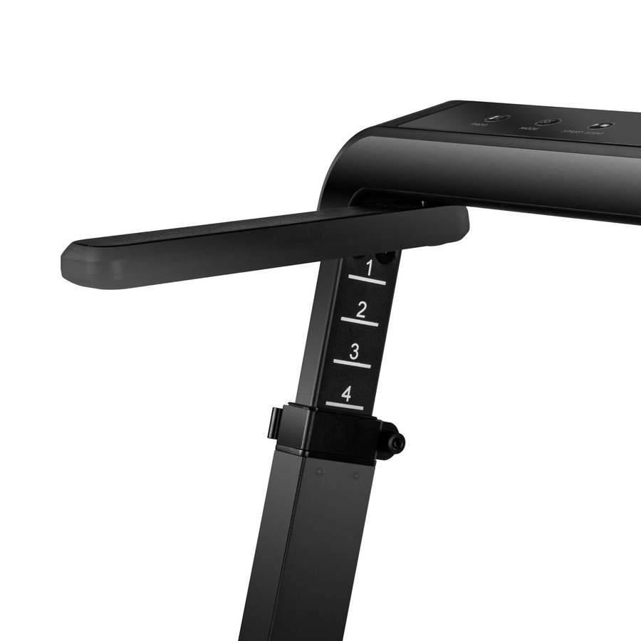 - Zintegrowane biurko: praktyczne miejsce na laptopa, tablet lub smartfon – idealne do pracy i rozrywki w trakcie treningu.