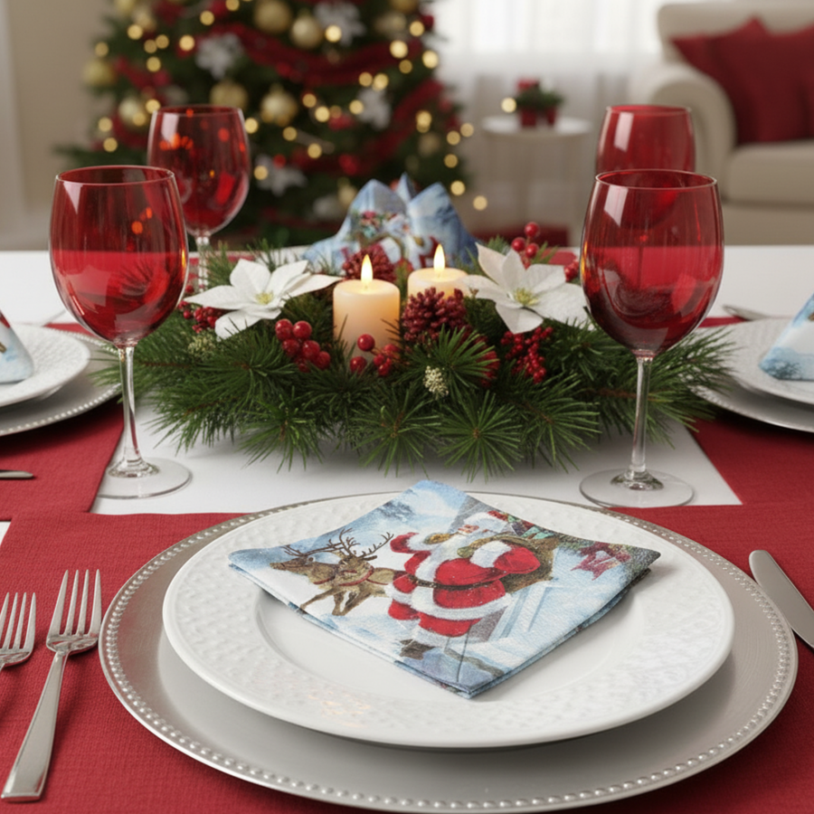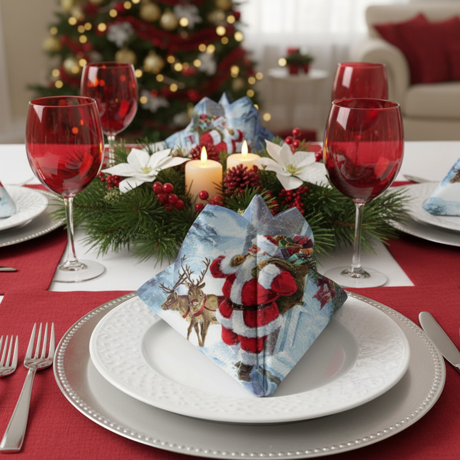 Świąteczne serwetki „Santa Is Coming” to idealny dodatek do bożonarodzeniowych dekoracji stołu. Dzięki wyjątkowemu, kolorowemu nadrukowi przedstawiającemu świąteczne motywy, wprowadzą do wnętrza ciepłą, radosną atmosferę. Sprawdzą się zarówno podczas rodzinnych spotkań, kolacji wigilijnych, jak i świątecznych przyjęć w większym gronie. Są praktyczne, estetyczne i doskonale uzupełniają zimowy wystrój.