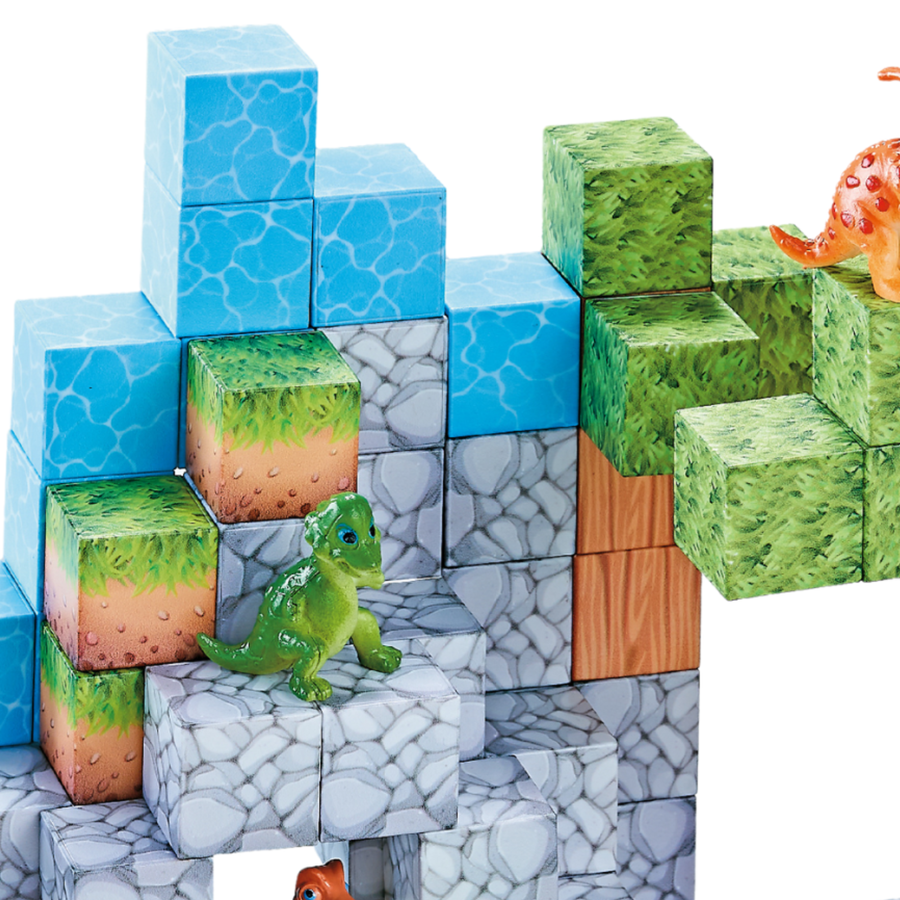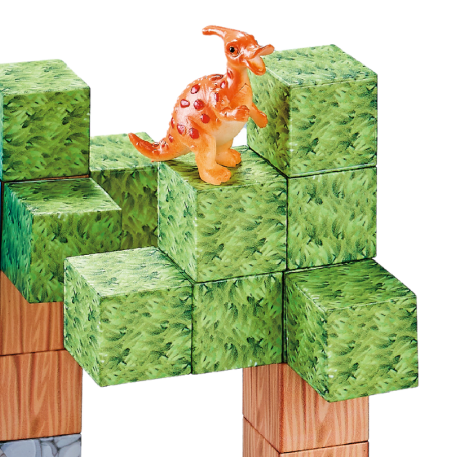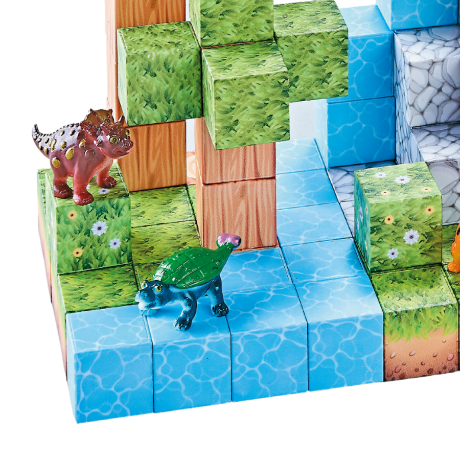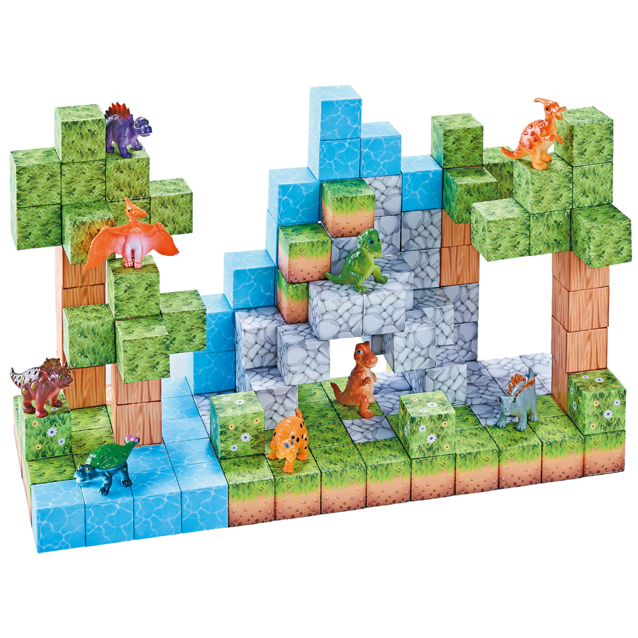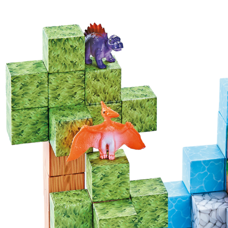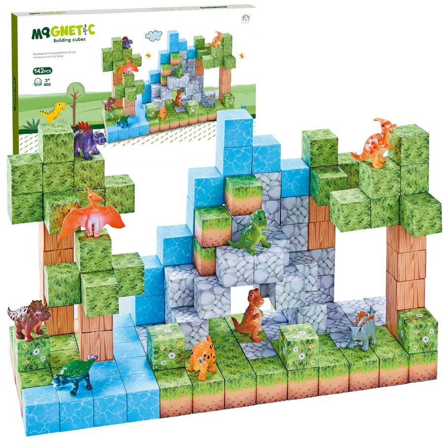 Zestaw zawiera 142 elementy – magnetyczne klocki oraz 10 figurek dinozaurów.