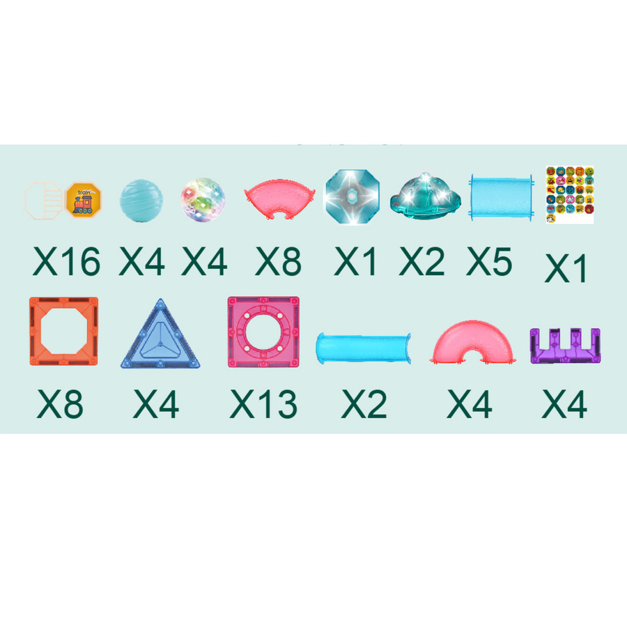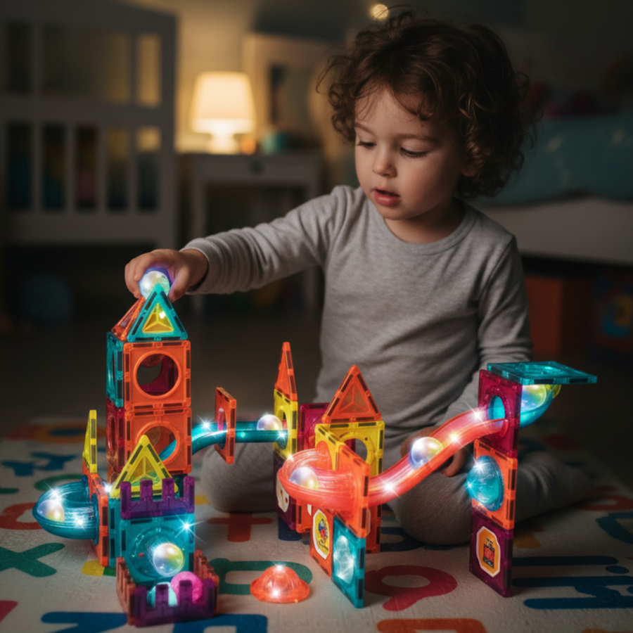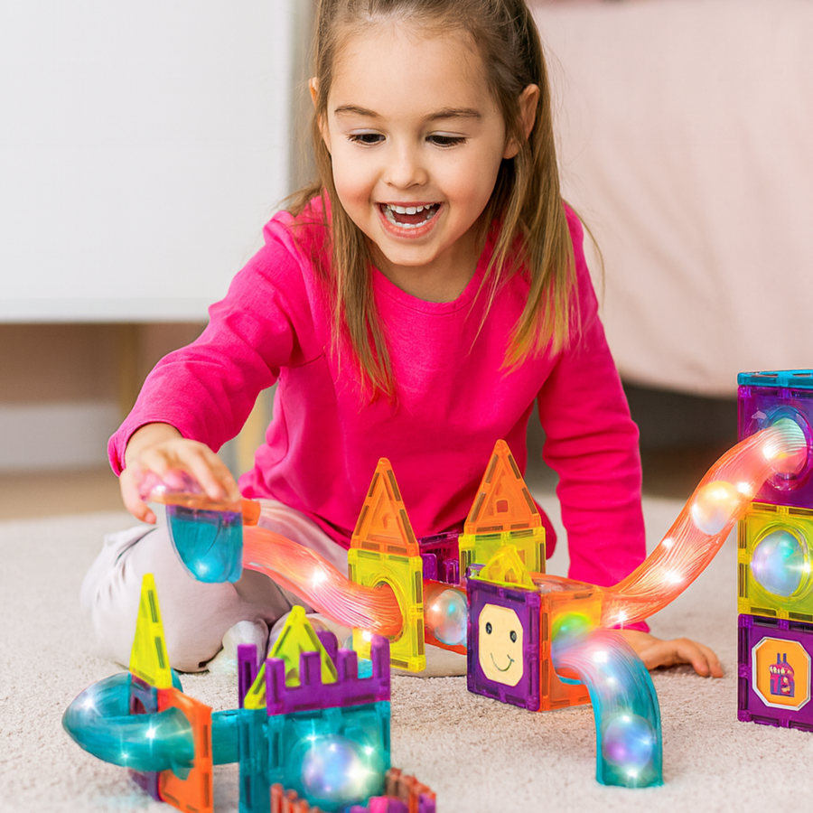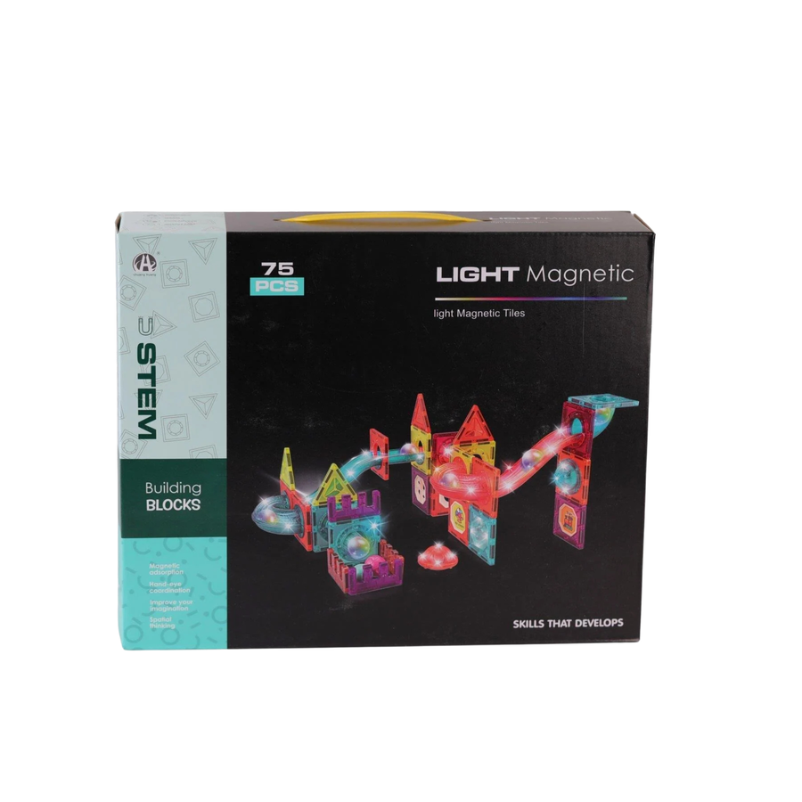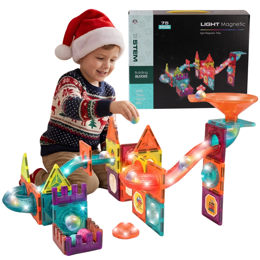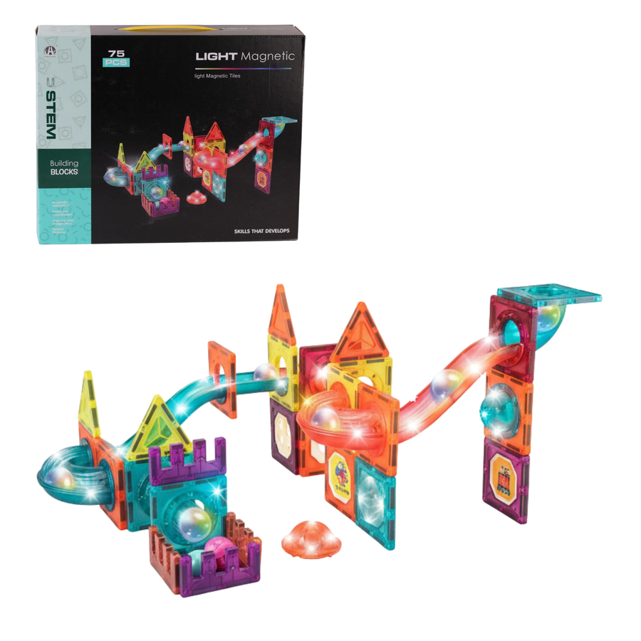 Zestaw 75-elementowych klocków magnetycznych to kreatywna zabawka, która pozwala dzieciom budować podświetlane konstrukcje 3D oraz dynamiczne tory kulkowe. W komplecie znajdują się magnetyczne płytki, różne elementy tunelowe, kulki oraz kształty umożliwiające tworzenie wielu efektownych i stabilnych budowli. Świecące fragmenty nadają zabawie wyjątkowego charakteru i zachęcają do eksperymentowania, wspierając rozwój wyobraźni i myślenia przestrzennego.