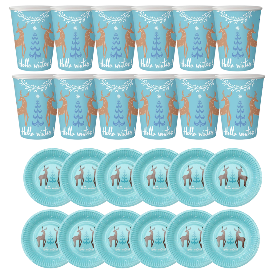 PAPIEROWY ZESTAW NACZYŃ „HELLO WINTER!” – 12 TALERZYKÓW I 12 KUBECZKÓW