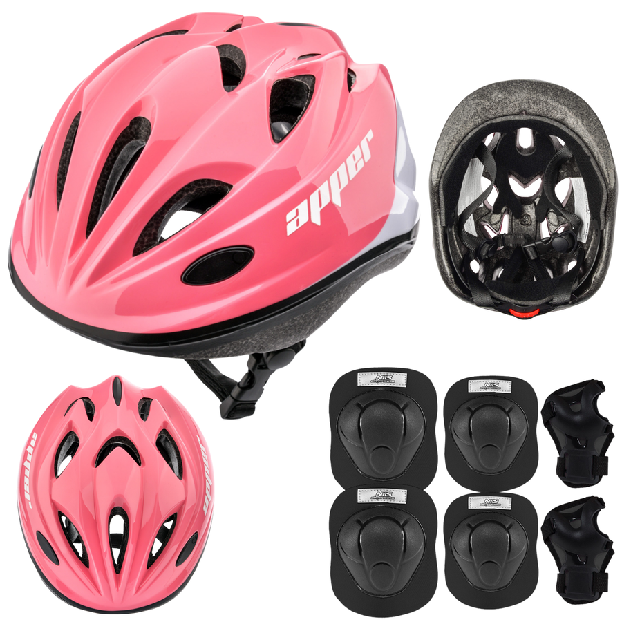 Kask dziecięcy KS07 oraz trzy pary ochraniaczy H210: na nadgarstki, łokcie i kolana.