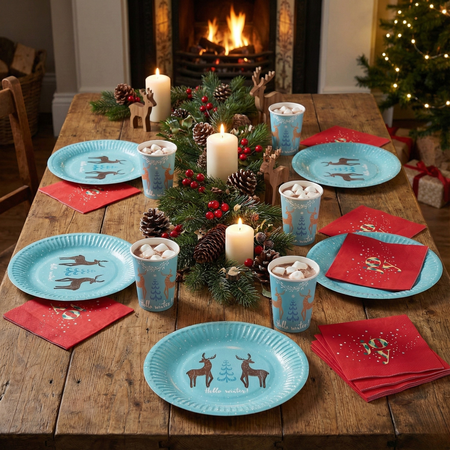 - Piękny zimowy design – motyw „Hello Winter!” i radosne serwetki „JOY” tworzą spójną, świąteczną dekorację stołu.