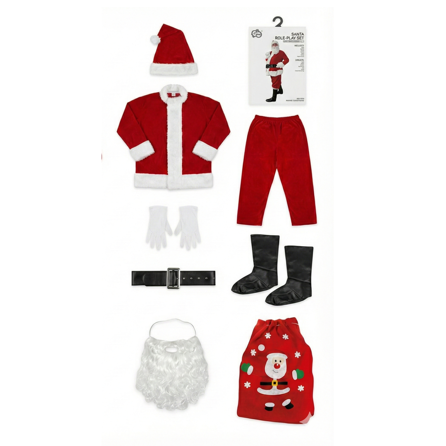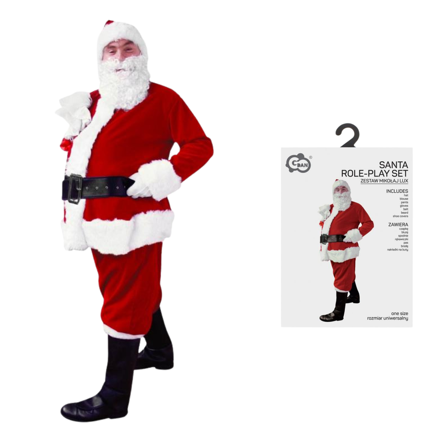 Zestaw Świętego Mikołaja z workiem na prezenty to kompletny, świąteczny komplet, który pozwoli stworzyć prawdziwie magiczną atmosferę Bożego Narodzenia. Profesjonalny strój Mikołaja wykonany został z trwałego, miękkiego poliestru w intensywnym czerwonym kolorze z klasycznymi białymi wykończeniami. W zestawie znajdują się wszystkie niezbędne elementy – bluza, spodnie, czapka, nakładki na buty, pasek, rękawiczki oraz broda. Całość uzupełnia duży czerwony worek na prezenty z uroczą aplikacją Świętego Mikołaja i śnieżynkami, zapinany na praktyczny sznurek.