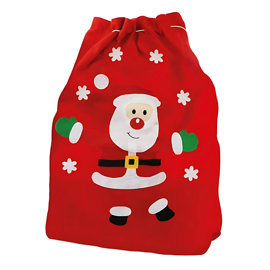 - Duży worek na prezenty – czerwony, ozdobiony aplikacją Mikołaja i śnieżynkami, zamykany na sznurek.
