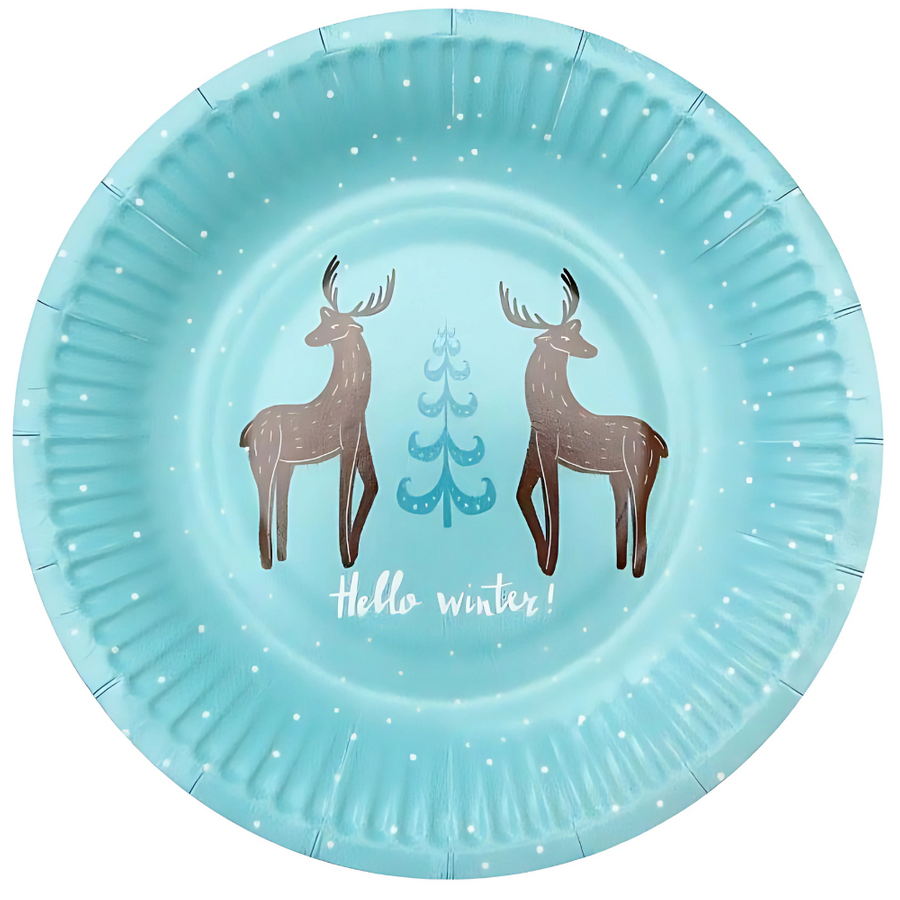 Zestaw „Hello Winter!” to urocza, zimowa kolekcja jednorazowych naczyń, idealna na świąteczne spotkania, rodzinne przyjęcia i zimowe uroczystości. W zestawie znajduje się 6 jasnoniebieskich talerzyków oraz 6 papierowych kubeczków, utrzymanych w spójnym, zimowym stylu. Oba elementy zdobią grafiki dwóch reniferów, świątecznej choinki oraz napis „Hello Winter!”, a całość uzupełniają białe, śnieżne kropki tworzące przytulną, radosną atmosferę. To doskonałe połączenie funkcjonalności i pięknego designu, które zachwyci zarówno dzieci, jak i dorosłych.