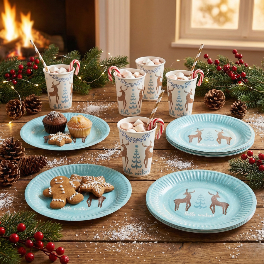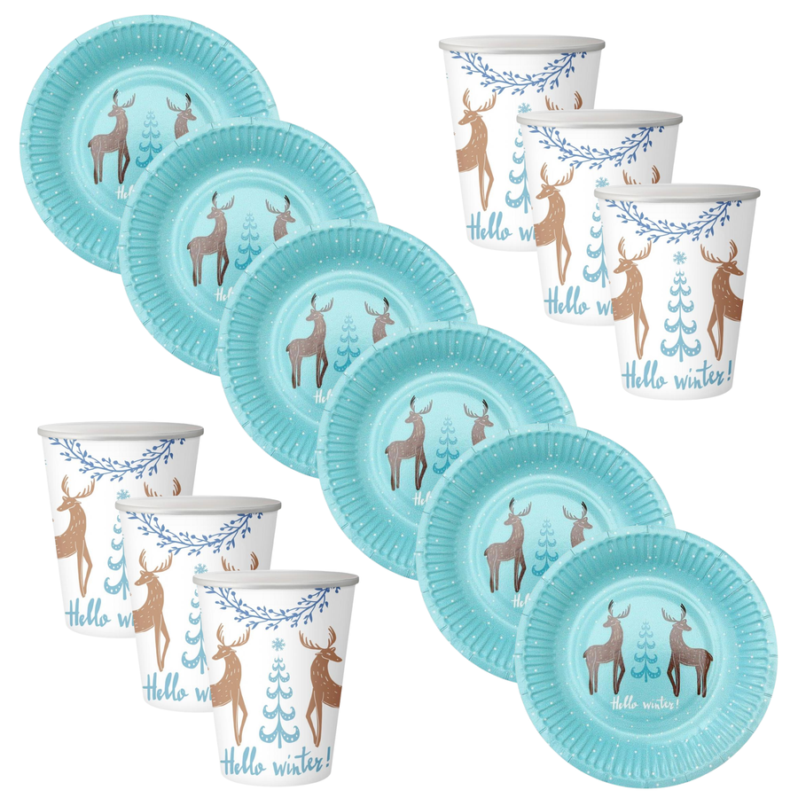 Zestaw papierowych talerzyków i kubeczków „Hello Winter!” – jasnoniebieska, zimowa dekoracja stołu