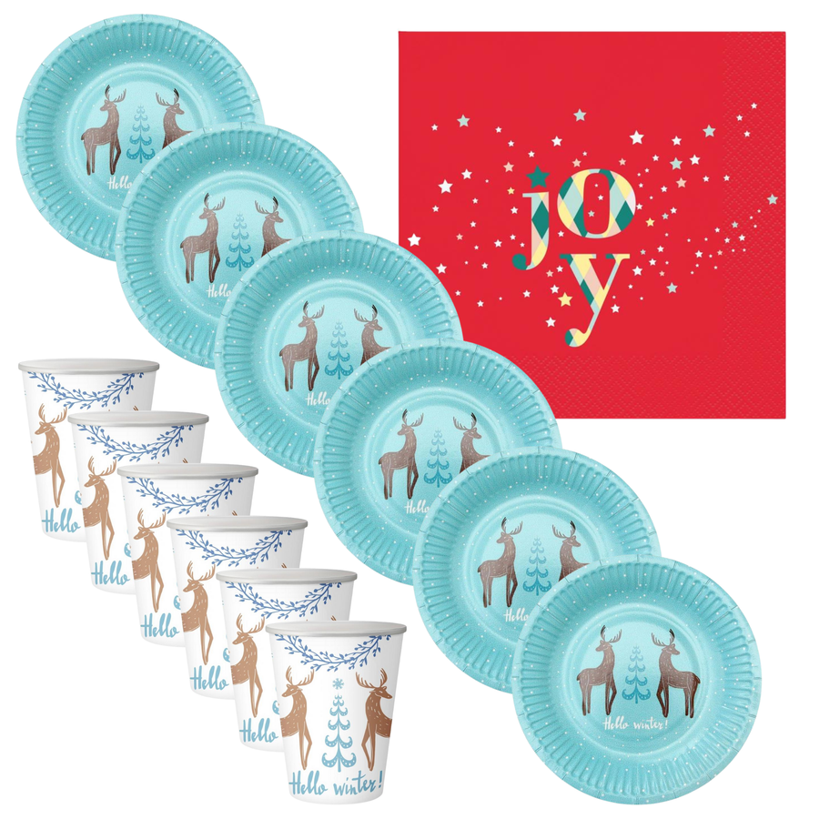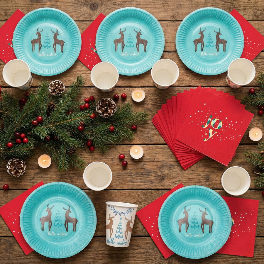 - Kompletny zestaw – 6 talerzyków, 6 kubeczków i 20 serwetek o spójnej, zimowej stylistyce.