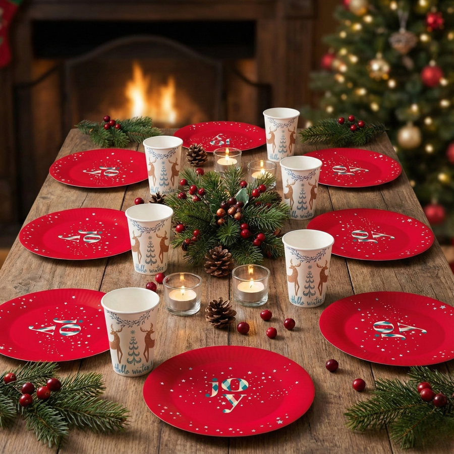 Zestaw świątecznych talerzyków „JOY” i kubeczków „Hello Winter!” – idealny na zimowe spotkania
