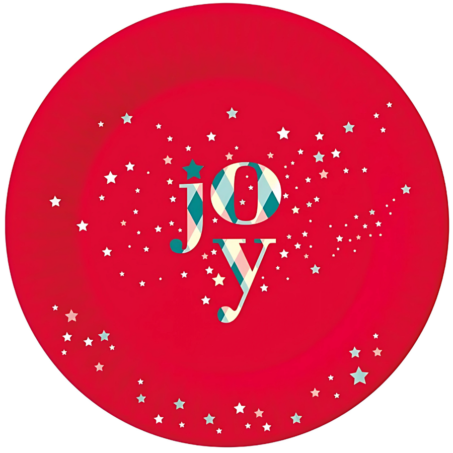 • Talerzyki „JOY” – czerwone tło, białe gwiazdki i dekoracyjny napis z geometrycznym motywem rombów.