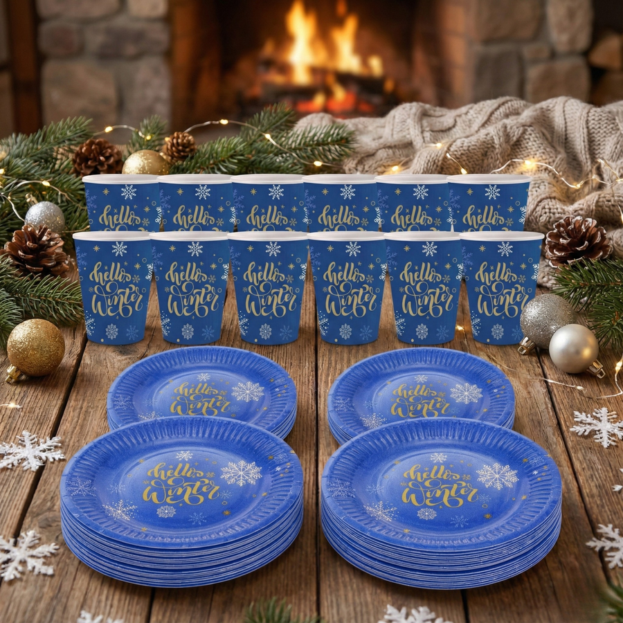 Zestaw naczyń papierowych „Hello Winter” to eleganczna i praktyczna propozycja na zimowe spotkania, rodzinne uroczystości oraz świąteczne przyjęcia. W komplecie znajduje się 12 talerzyków oraz 12 kubeczków, dzięki czemu świetnie sprawdzi się zarówno na mniejszych, jak i większych wydarzeniach. Granatowe tło, złoty napis „Hello Winter” oraz subtelne białe i złote płatki śniegu tworzą wyjątkowy, zimowy klimat, który doda uroku każdemu stołowi. Jednorazowe wykonanie gwarantuje wygodę i szybkie sprzątanie po zakończonej imprezie.