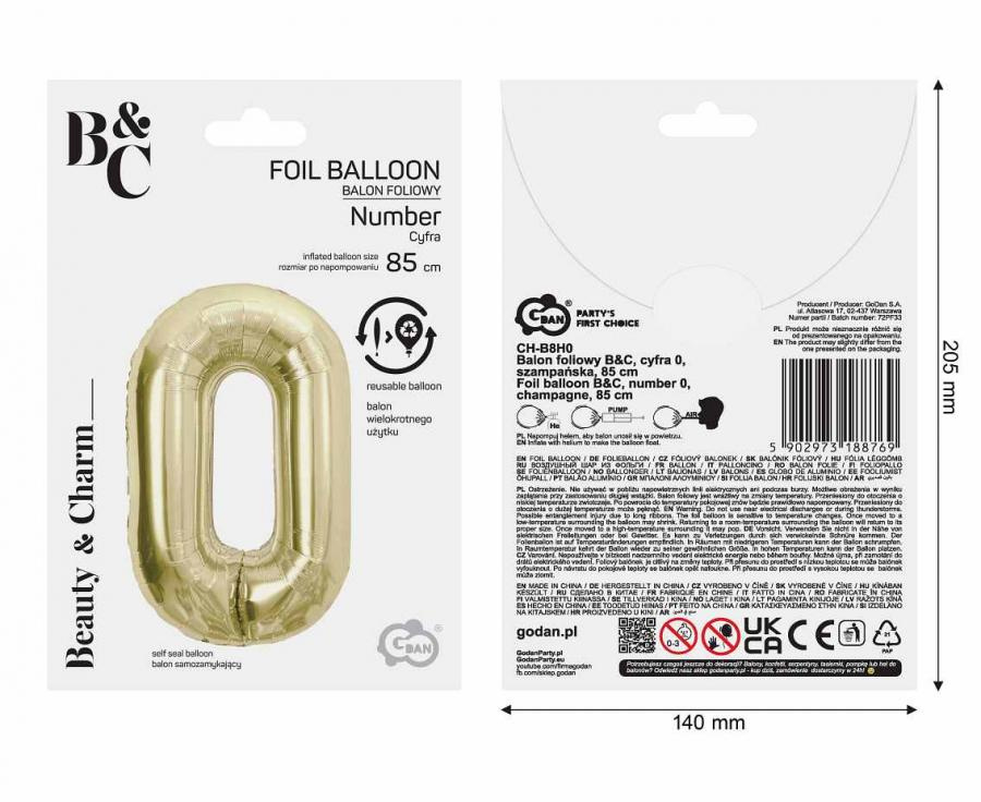 Balon foliowy w kształcie cyfry 0 w eleganckim, szampańskim kolorze to efektowna dekoracja na wyjątkowe okazje. Doskonale sprawdzi się podczas urodzin, rocznic, jubileuszy, sylwestra, przyjęć noworocznych oraz sesji zdjęciowych. Dzięki dużemu rozmiarowi 85 cm balon jest wyraźnie widoczny i stanowi mocny akcent każdej aranżacji. Należy do kolekcji Beauty&Charm marki GoDan, która wyróżnia się estetyką i wysoką jakością wykonania. Balon przeznaczony jest do napełnienia helem – po napompowaniu unosi się w powietrzu, tworząc lekki i elegancki efekt dekoracyjny. Wyposażony w zawór samozamykający, umożliwia szybkie i wygodne napełnianie bez potrzeby wiązania.