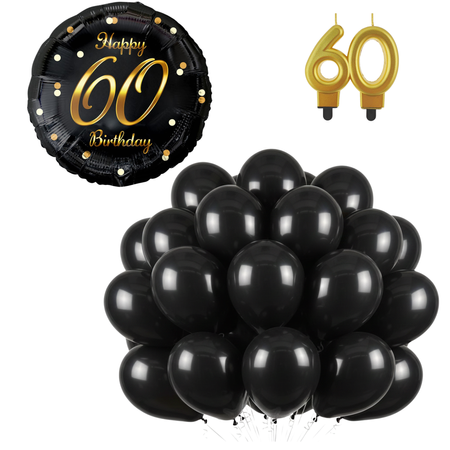 Balony Klasyczne Czarne 12" + Balon Foliowy 18" Na 60 Urodziny + Świeczka