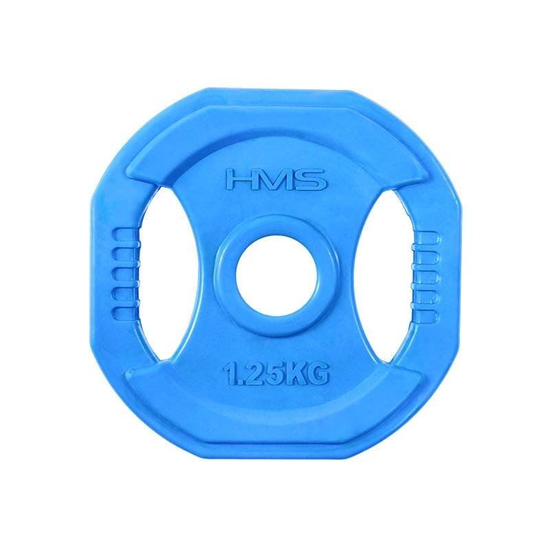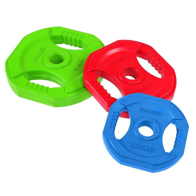 W zestawie znajdują się trzy pary talerzy o różnych wagach – każdy kolor odpowiada innemu obciążeniu, co ułatwia ich rozpoznawanie.