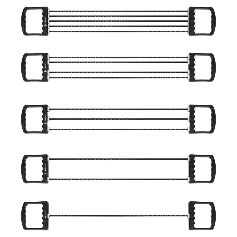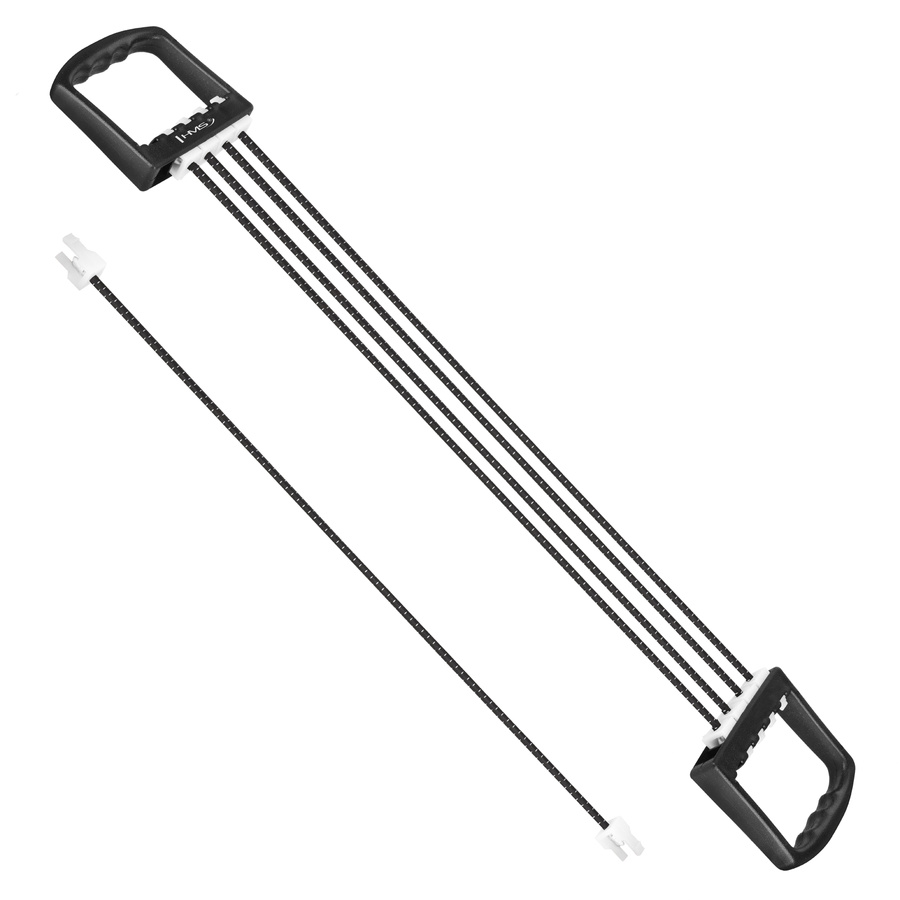 • Regulowany opór – pięć gumowych lin pozwala łatwo zmieniać intensywność ćwiczeń poprzez dodawanie lub zdejmowanie poszczególnych linek.
