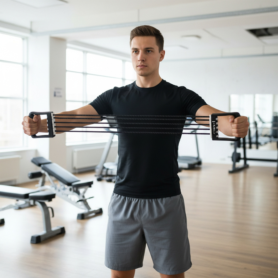 Ekspander świetnie sprawdza się przy treningach ramion, klatki piersiowej, pleców, brzucha oraz ćwiczeniach rehabilitacyjnych.