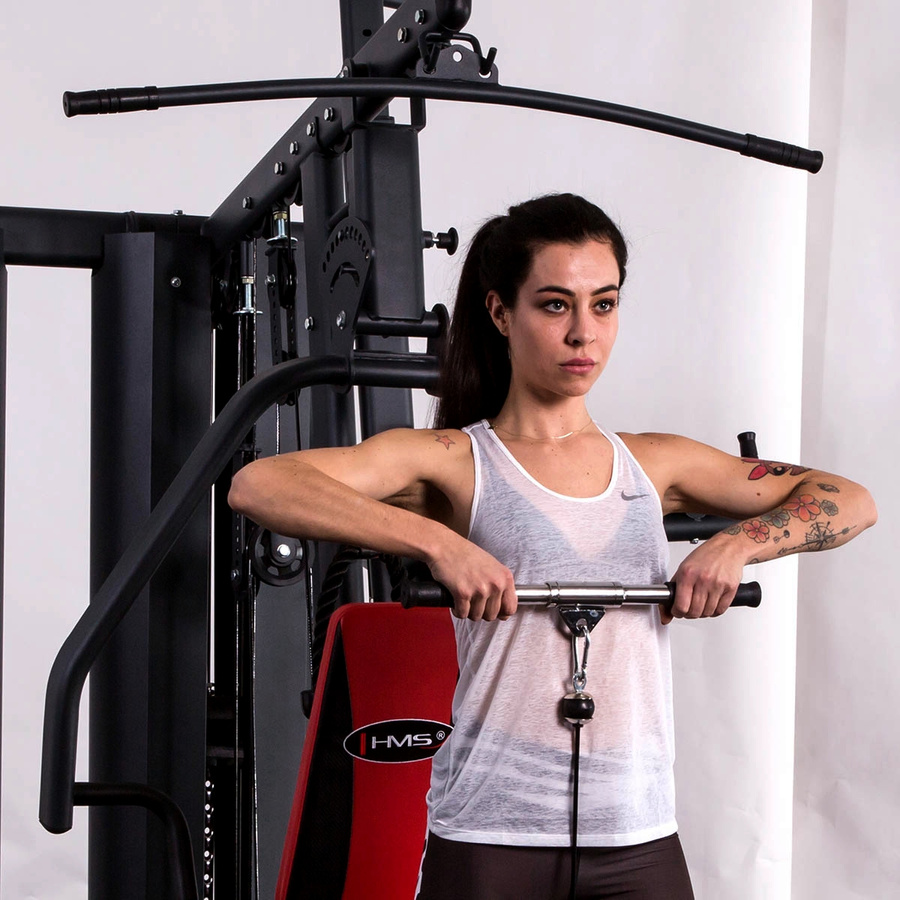UW12 marki HMS to solidny, krótki drążek przeznaczony do treningu na wyciągu górnym i dolnym. Jest to wszechstronne akcesorium, które umożliwia wykonywanie szerokiej gamy ćwiczeń angażujących górne partie ciała – od mniejszych grup mięśniowych, takich jak biceps i triceps, przez przedni i boczny akton mięśni naramiennych, aż po mięśnie najszersze grzbietu oraz prostowniki pleców.