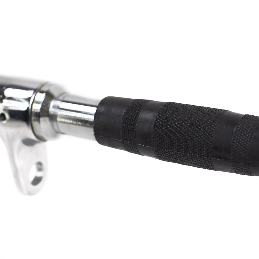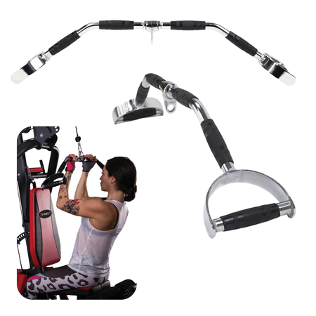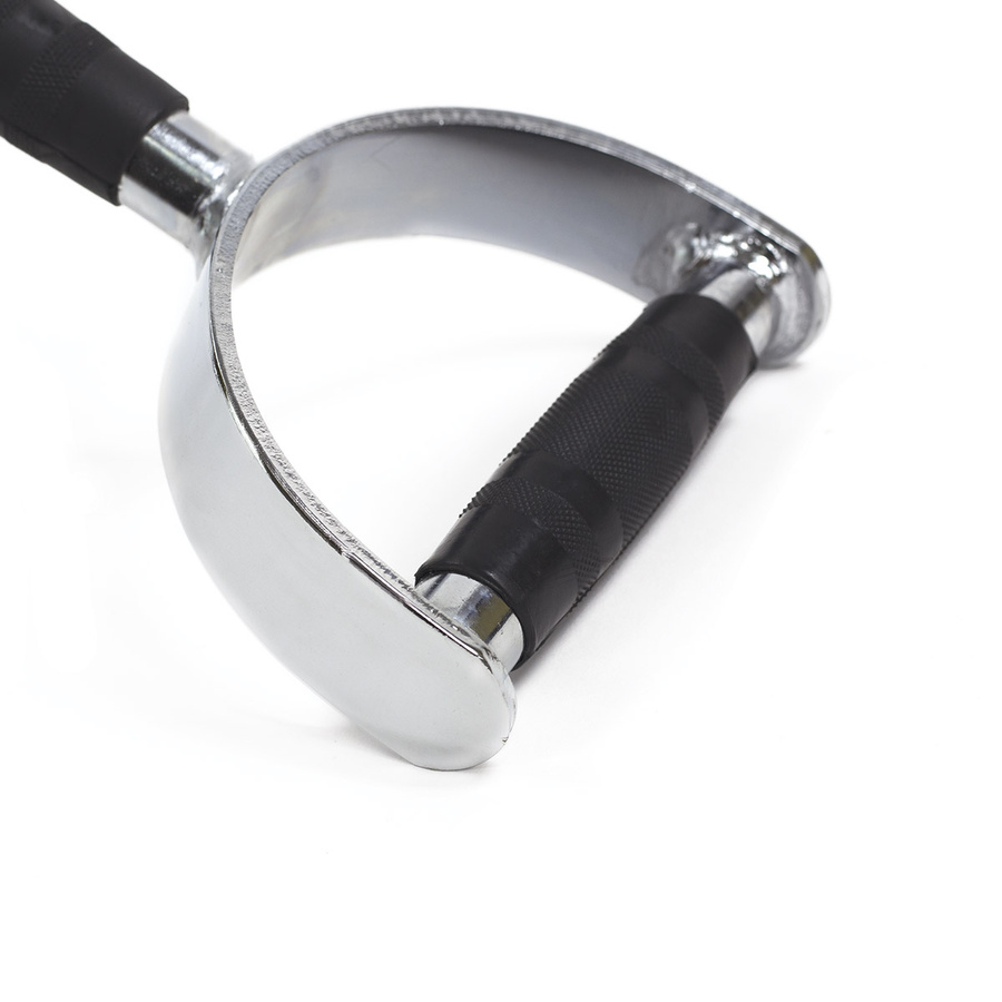 Rękojeści w skrajnych pozycjach ustawione są w neutralnym chwycie, co umożliwia zaangażowanie alternatywnych przyczepów mięśniowych w porównaniu do klasycznych prostych uchwytów. Dodatkowo, ogumowane uchwyty zapewniają pewny i komfortowy chwyt bez ryzyka poślizgu, nawet podczas intensywnego treningu. Kątowe ustawienie rękojeści sprzyja prawidłowej technice, szczególnie przy ściąganiu drążka do klatki piersiowej.