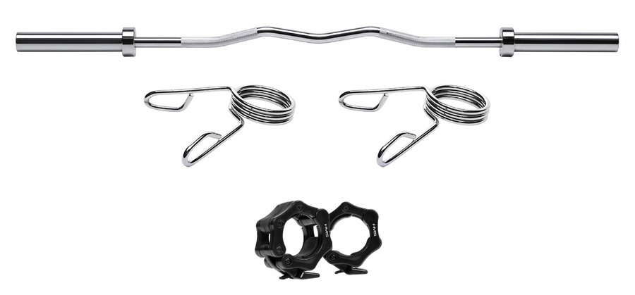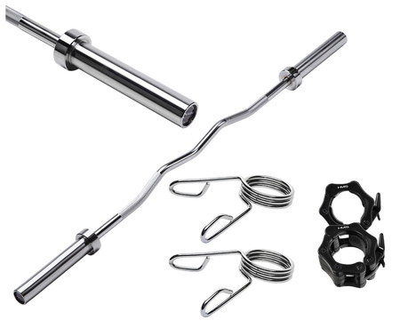 W zestawie znajdują się dwa zaciski sprężynowe oraz dwa zaciski szczękowe ZG1000B, które stabilnie utrzymują obciążenia na miejscu, zwiększając bezpieczeństwo i komfort treningu. Łamany kształt gryfu znacząco odciąża nadgarstki i pozwala na bardziej naturalne ustawienie dłoni, co jest szczególnie ważne przy ćwiczeniach takich jak uginanie ramion czy wyciskanie.